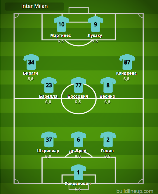 Интер: Ханданович – Шкриниар, де Врей, Годин – Бираги (Лазаро, 66), Барелла, Брозович, Весино (Сенси, 68), Кандрева – Мартинес, Лукаку (Политано, 73).